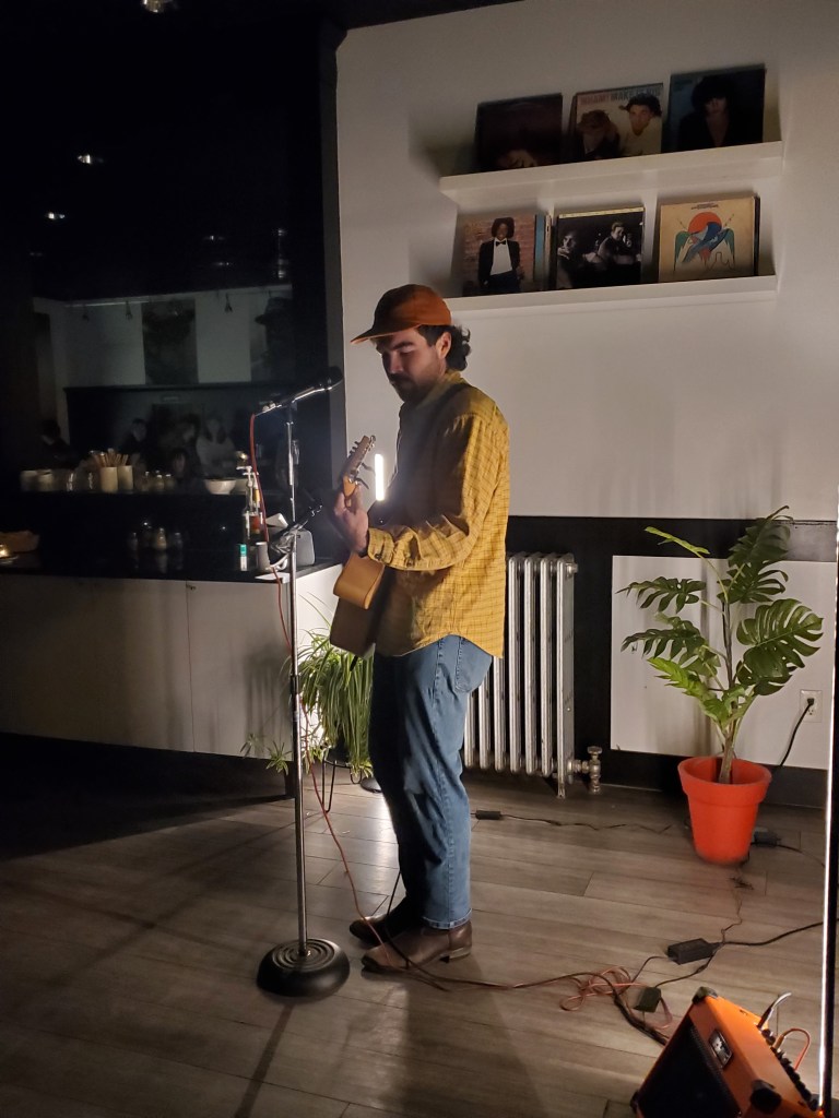 On Thursday January 16 Caffe Motivo on 229 Victoria Street hosted their bimonthly open mic music night. There were plenty of musicians on hand. They primarily played acoustic guitars and sang. There were many solo musicians and a few duos and one trio. While the genres varied a bit, mostly folk/roots and pop tunes were played. The first musician I saw was Joey Marini. He played guitar and sang 50 Ways to Leave Your Lover, the popular Paul Simon composition. Up next, CJ, a regular in this format, played mostly originals. Troy Bishop, who also performs in other venues around town, worked on a wintery theme with his original compositions. He told of a spur of the moment trip to Mount Robson in the dead of the winter and writing tunes in his SUV when it was minus 15 degrees.