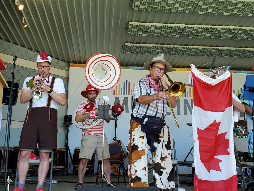 Then, the iconic Kamloops Rube Band played songs appropriate to Canada Day. They played “Canada on the March,” and “Birthday Bouquet.” They managed to add a bit of fun and silliness with their costumes and presentation of tunes, as per usual.