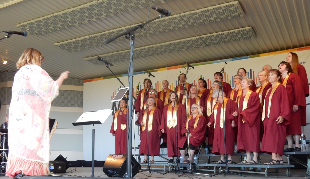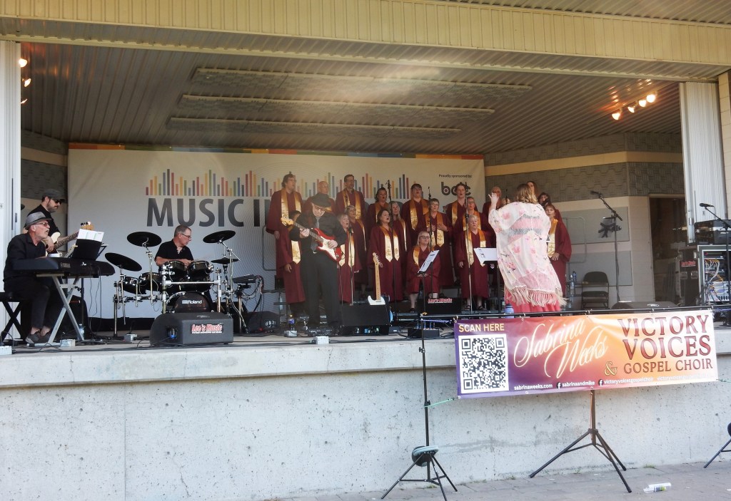 Sabrina Weeks and Swing Cat Bounce are a local swinging blues band and they have had much success over the years. In 2012, Sabrina Weeks and Swing Cat Bounce won a Maple Blues Award for best New Artist/Group of the Year and their CD charted #1 on the Roots Music Report charts. Lately, Weeks has combined teaching vocals and gospel music. She has come up with the Victory Voices Gospel Choir. On July 6 at Music in the Park she combined both groups for an evening of gospel, blues, swing and rock sounds.