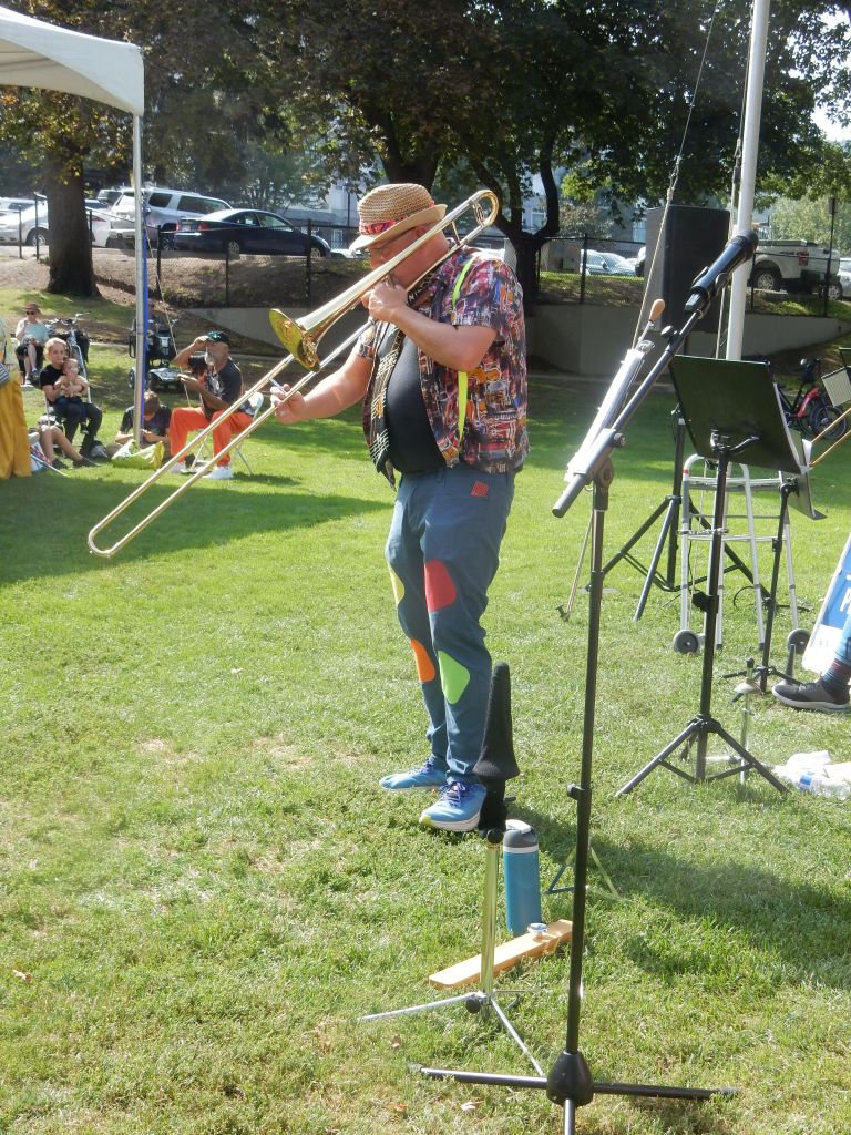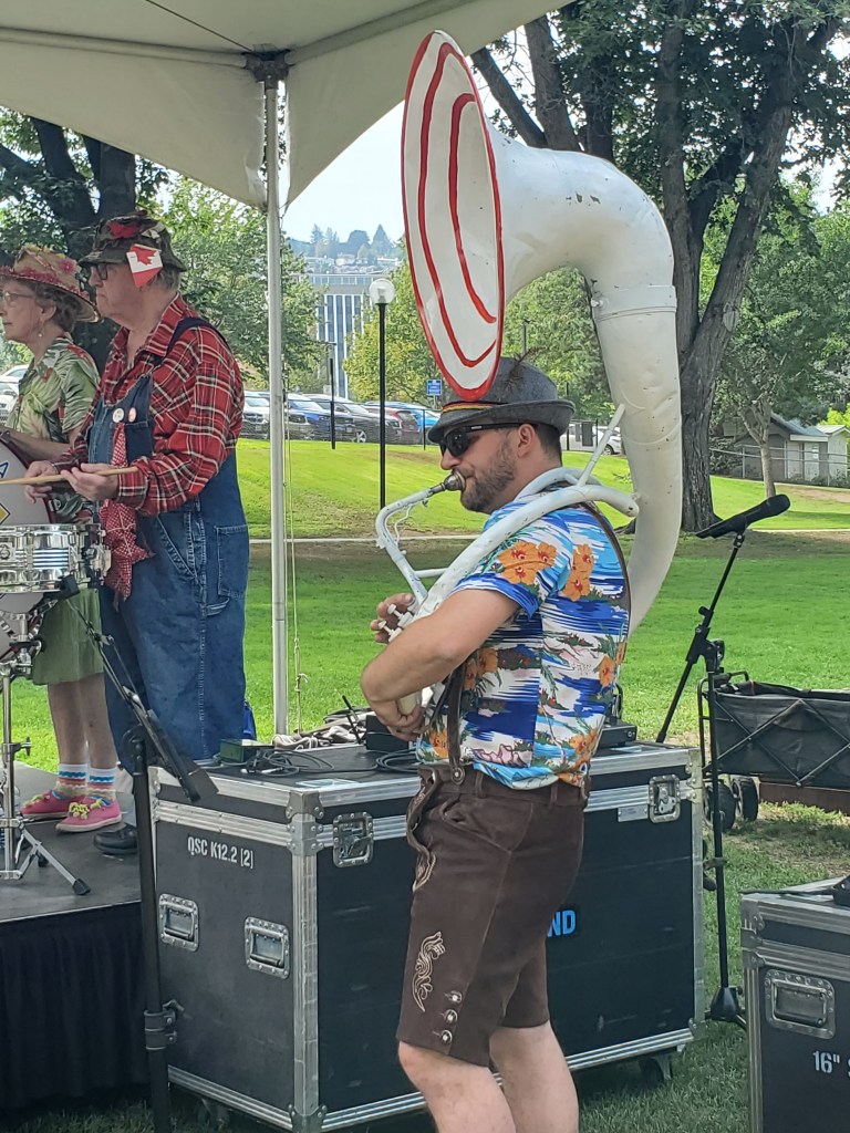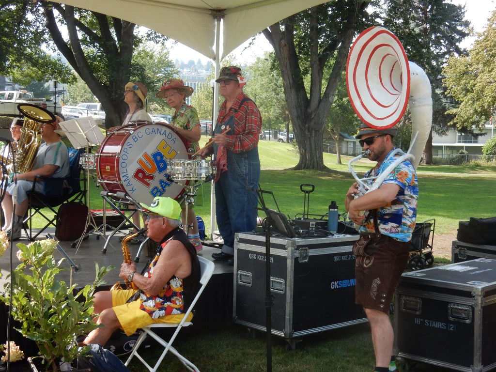 As I didn’t get there at the beginning, I may have missed some music. The music act that I heard was the iconic Kamloops Rube Band. After lunch was served they played a long set of music that included plenty of Dixeland and other genres of Jazz and some fun pop songs, too. The band leader and his mates do a bit of a vaudeville act throughout the performance with plenty of Dad jokes and some witty ones, too.