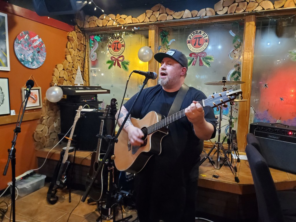 Then it was a cab downtown with time to spare before the New Year’s Eve performances at Pizza Pi on Victoria Street. I checked out the karaoke scene at the Central Station Pub. An exuberant audience sang their hearts out and seemed to be having a good time. Then it was off to Pizza Pi. A mysterious poster mentioned a show containing the music of important grunge and rock bands, plus a surprise guest. A drink or piece of pizza was included in the reasonable price of admission. This all ages show was very enjoyable. The suprise opening solo act was none other than, the owner and this evening’s chef, Greg Smith. He did a great job playing covers of Bad Religion and Tom Petty.