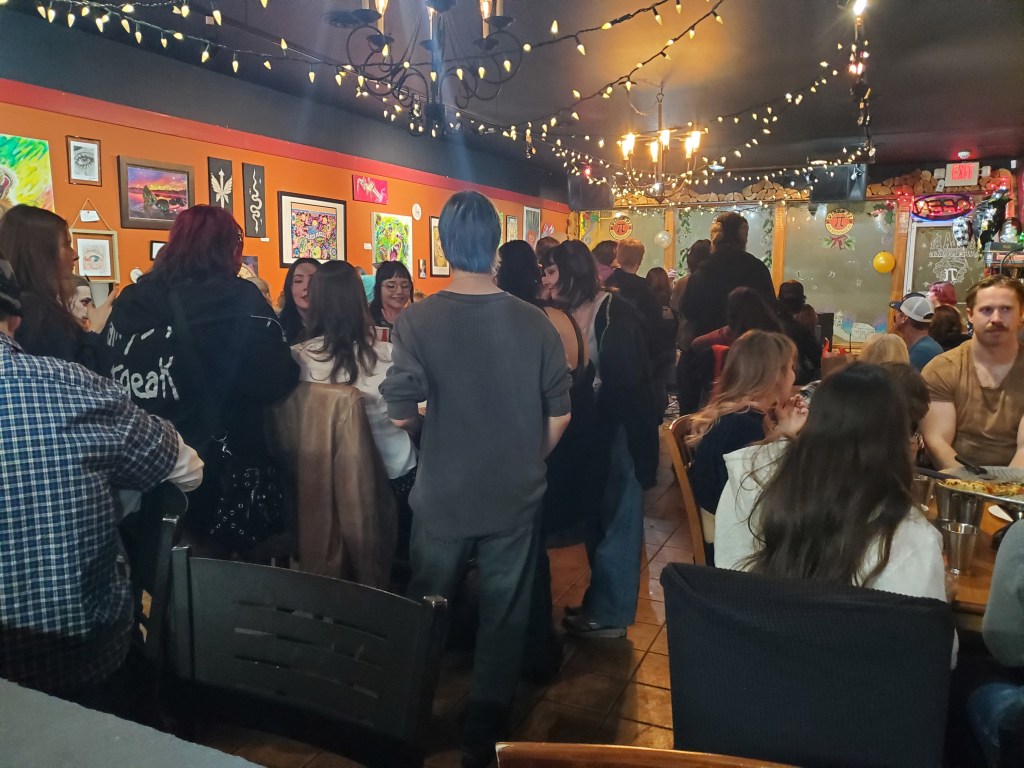 The all-ages crowd packed Pizza Pi and sang along often. It was a wonderful New Year’s evening.
